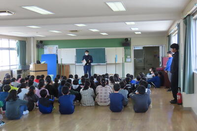 19日(木)に、盛岡中央消防署松園出張所より消防士の方をお招きして、社会科「火事からまちを守る」のインタビュー学習を行いました。